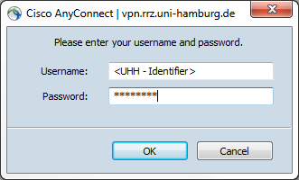To login to the VPN please provide your UHH-Account-Name: e.g. fmnv165, followed by your RRZ-Password (same password as for your email-account).